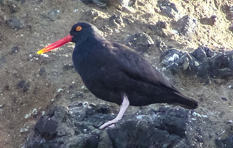 The jet black plumage, bright red bill, red-rimmed golden eyes, and sharp cries, whistles and yelps of the black oystercatcher Haematopus bachmani cannot be mistaken for any other bird.