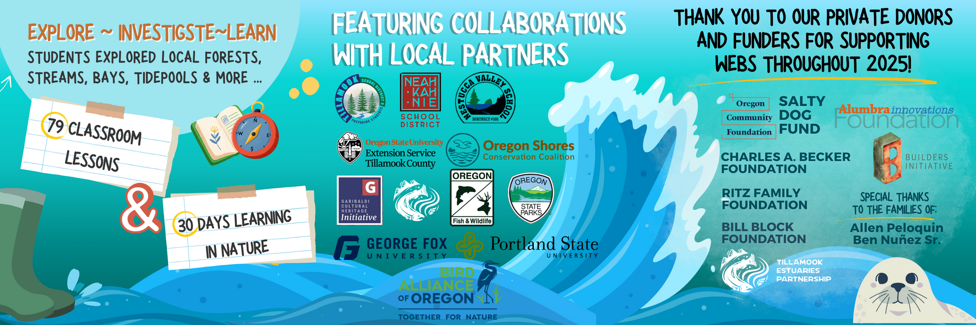 WEBS works to build a community of environmental stewards around the Netarts Bay watershed and the areas between Cape Meares and Cape Lookout. Each year, our volunteers contribute to over 35 community education programs and over 25 Tillamook County school field trips as well as several actionable stewardship programs.